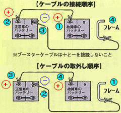 赤ケーブル:故障車の+ → 救援車の+ 黒ケーブル:救援車の− → 故障車の車体金属部